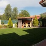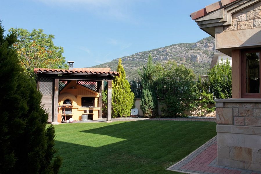Jardín amplio con zona de barbacoa y espacios de descanso.