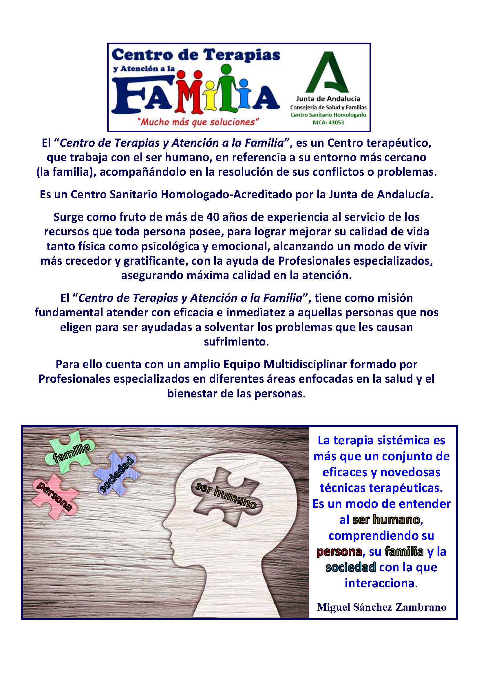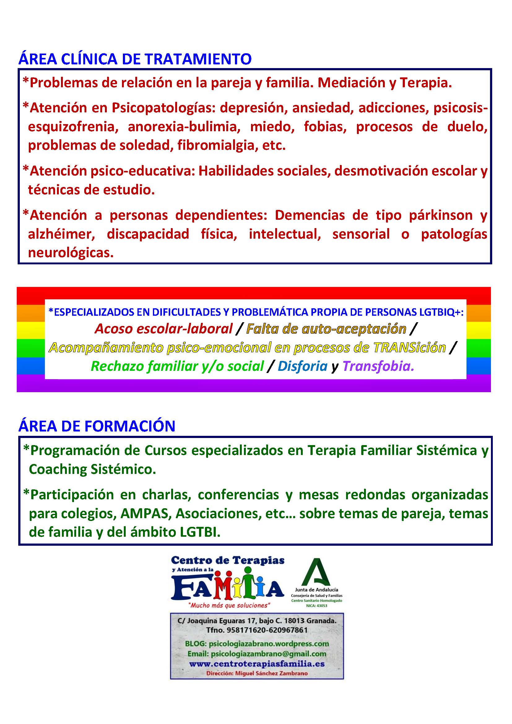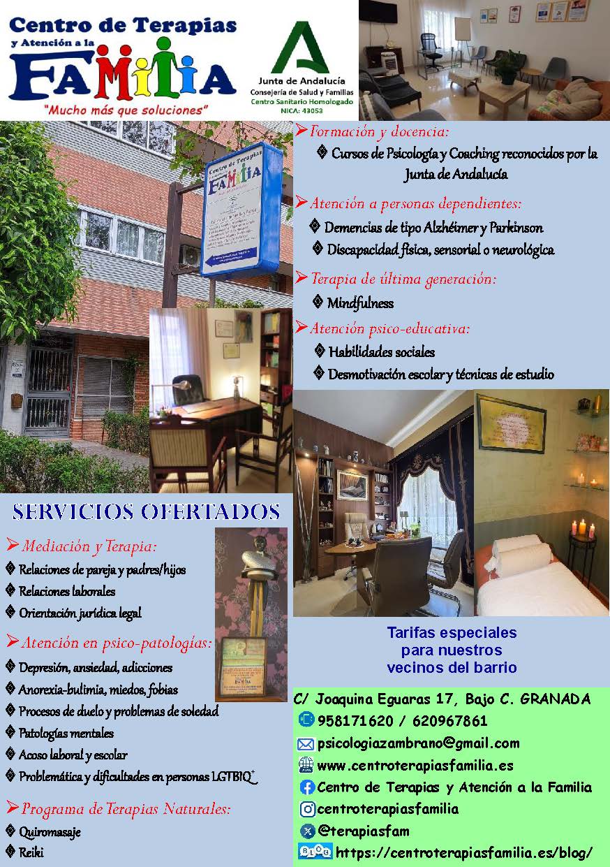 Centro de Terapias y Atención a la Familia Psicología / Nuevo Popular Síguenos en: Listing ID: 9112 Contact details C/ Joaquina Eguaras 17, Bajo CGranada,Andalucía,18013 958 17 16 20 psicologiazambrano@gmail.com https://www.terapiaszambrano.es/ Facebook Twitter WhatsApp
